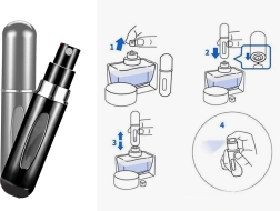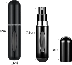 Polnjenje je hitro in čisto: preprosto odstranite glavo izvirnega parfuma in nataknite atomizer na cevko z mehanskim razpršilnikom. Z večkratnim pritiskom se steklenička hitro napolni. Zaradi kompaktnih dimenzij 8 × 1,5 cm se prilega v žep, torbico ali ročno prtljago.