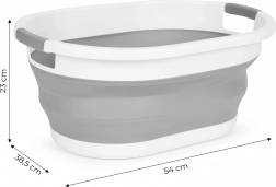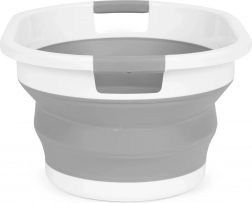 Po stisku se košara splošči v nizek profil, zato jo zlahka shranite za pralni stroj, v omarico ali v avto. V razprtem stanju nudi 20 litrov prostora ne le za perilo, temveč tudi za igrače, drobni tekstil ali kot umivalnik/skleda za domača opravila.