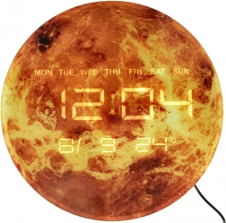 Dizajnerska ura z realistično grafiko planeta Mars bo postala dominantni element vsakega interierja – od otroške sobe do delovnega kabineta. Pregleden LED zaslon ponuja čas v formatu 12/24 h, datum (M/D/L), angleško kratico dneva v tednu in trenutno temperaturo v °C.