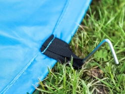 Lahka konstrukcija s torbo in ročajem olajša prenašanje. Priloženih je 5 količkov za čvrsto sidranje na pesku in travi.