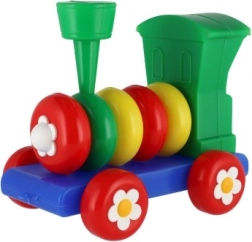 Vlak je izdelan iz plastike v izrazitih barvah, ki pritegnejo pozornost otrok, ter je okrašen z motivi cvetlic na kolesih.