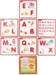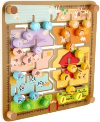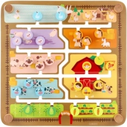 Pameten in zabaven pripomoček za predšolske otroke: obojestranska plošča skriva dva sveta. Na kmetiji otroci premikajo drsnike z živalmi, obrazi in sadjem po izrezkanih poteh na njihova mesta. Z obračanjem plošče se ta spremeni v abecedni labirint – naloga je pripeljati drsnik z začetno črko do prave živali (poimenovanja so v angleščini), zato se igrivo urijo črke in besedišče.
