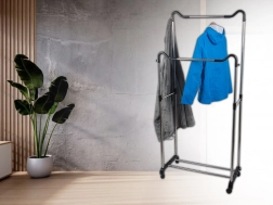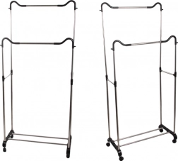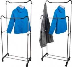 Premični garderobni stojal z dvojno palico je odlična rešitev za vsakodnevno organizacijo garderobe. Dve vodoravni palici ponudita več prostora za plašče, srajce ali jakne, medtem ko spodnja polica sprejme čevlje, torbe in druge dodatke. Zahvaljujoč štirim kolescem stojalo preprosto premaknete tja, kjer ga trenutno potrebujete.