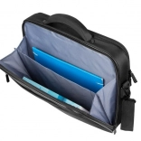 Prostor je razdeljen na tri glavne komore – podložen predel za prenosnik, zadnji žep v aktovkovnem slogu za dokumente in sprednji organizator za dodatke. V notranjosti so dodatni žepi na zadrgo in ježki za adapter, miško in drobnarije, poleg tega nastavljiv ramenski trak z blazinico za udobje.