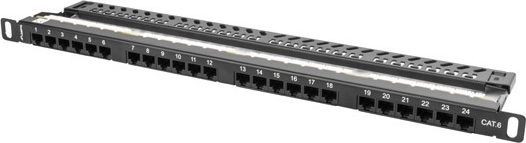 Patch panel opremljen z 24 neoklopljenimi porti RJ-45 kategorije 6. Zaradi uporabe IDC/LSA konektorjev je montaža enostavna in hitra. Vključen je tudi kabelski organizator za enostavno stabilnost med namestitvijo.