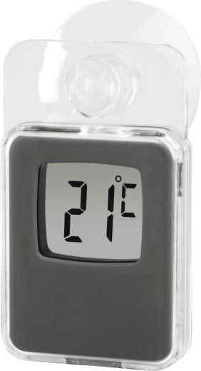 Praktičen okenski termometer za domačo in zunanjo uporabo s preglednim digitalnim zaslonom. Odporen na vremenske vplive, enostavna namestitev s priseskom in merilno območje od -20 °C do +50 °C naredijo ta termometer idealno izbiro za vsako okno.