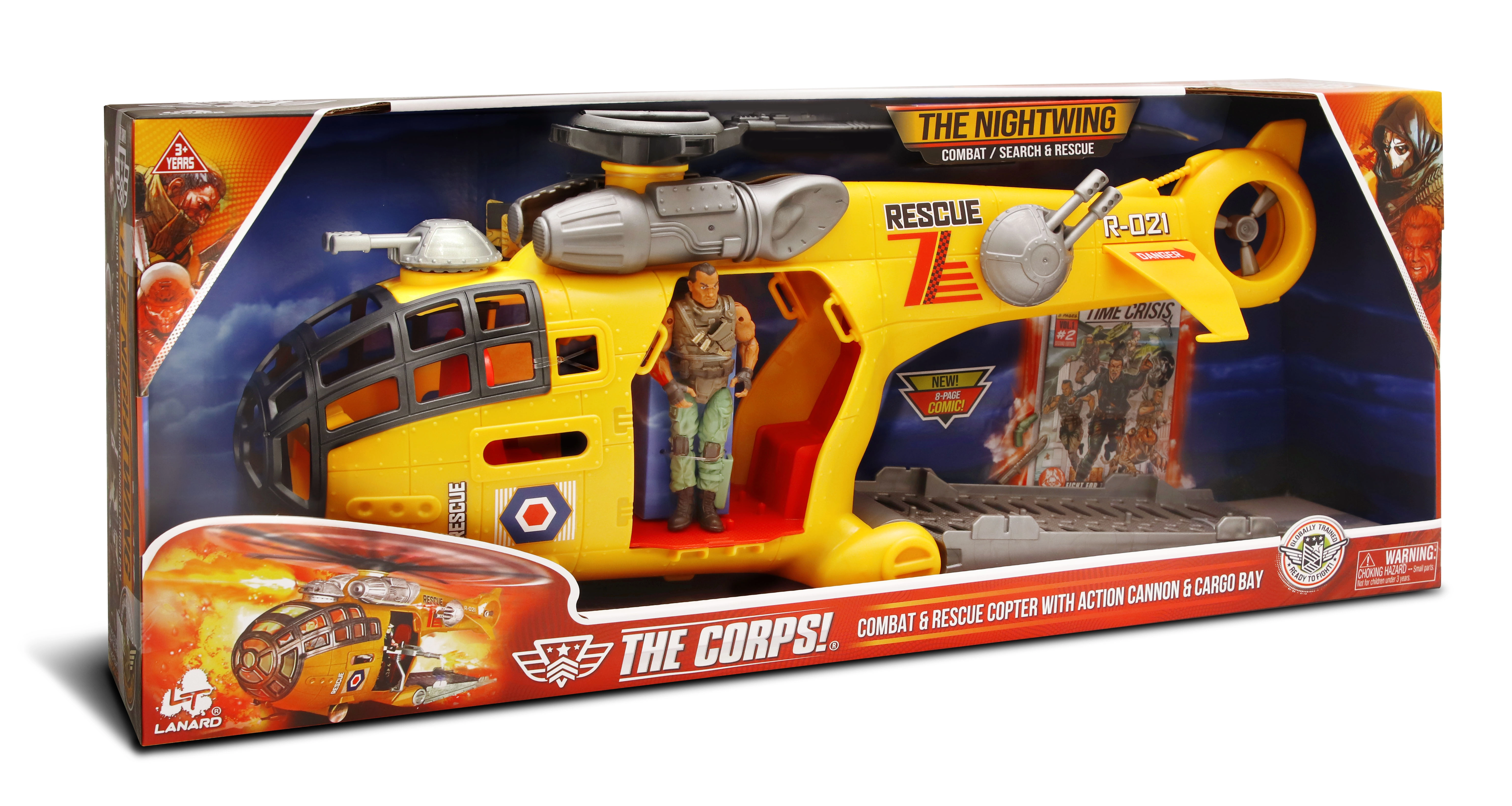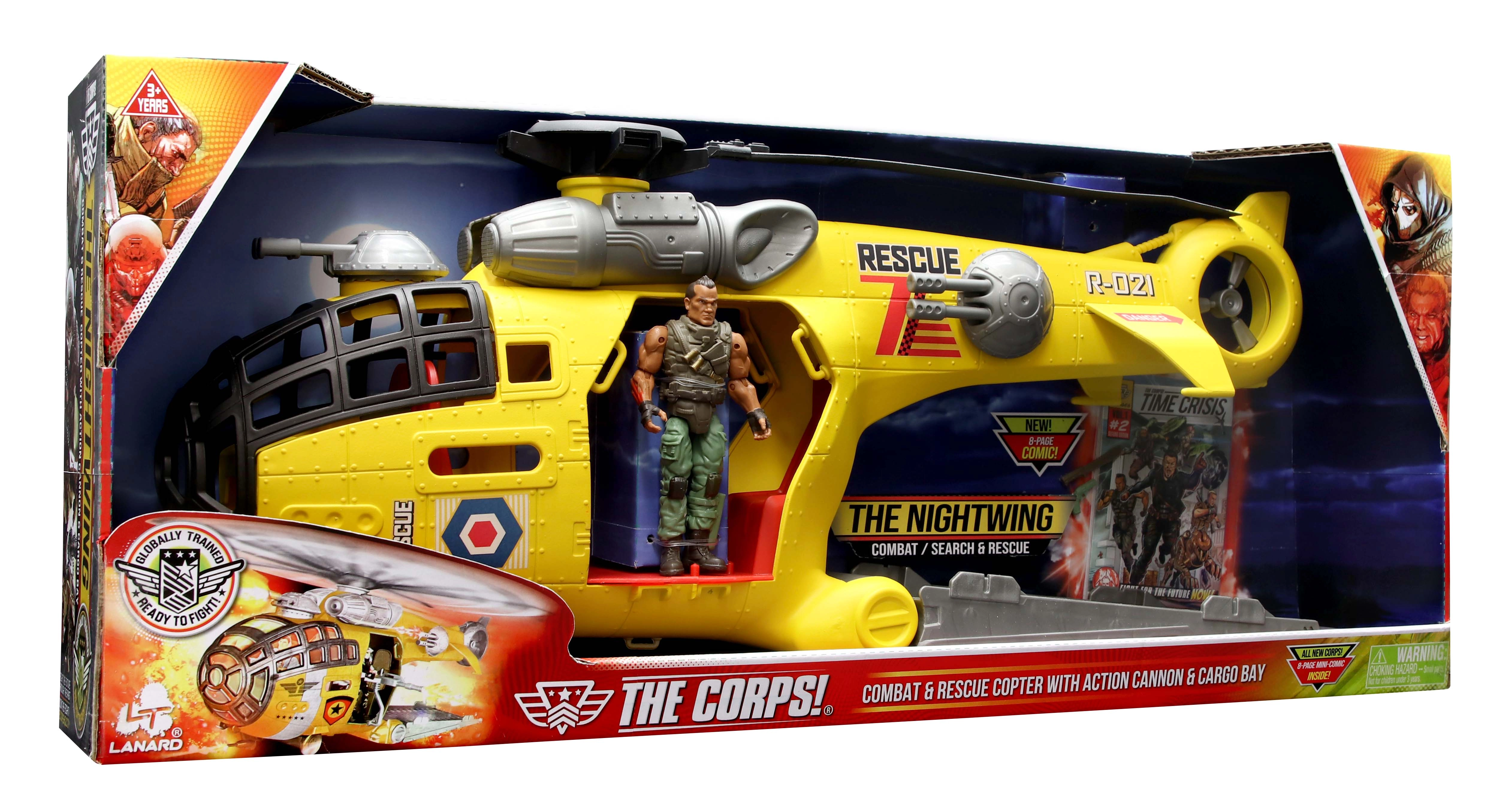 Vzletite v akcijo s helikopterjem The Corps! Nightwing. Realistični detajli in funkcionalni elementi spodbujajo domišljijo ter razvijajo ustvarjalno igro. Priložena je figurica vojaka, pripravljena na vsako misijo, ter strip, ki navdihuje lastne zgodbe.