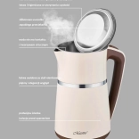 Električni grelnik vode Maestro ponuja kapaciteto 1,7 litra in zmogljiv motor 2200 W, kar omogoča hitro in učinkovito vrenje vode. Zahvaljujoč dvostenskemu dizajnu ostane površina konvice hladna, kar zagotavlja varnost pri uporabi. Ta konvica združuje trpežno plastično konstrukcijo s kakovostno notranjo nerjavečo jekleno 18/10, kar zagotavlja dolgo življenjsko dobo in enostavno vzdrževanje.