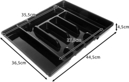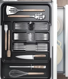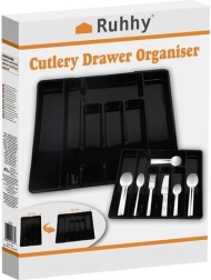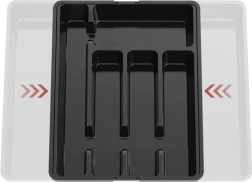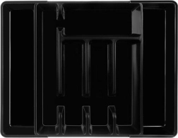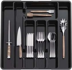 Praktičen črn organizator za predal z raztegljivim mehanizmom se zlahka prilagodi širini predala in ohrani ves pribor ter kuhinjski pripomočki na svojem mestu. Izdelan je iz odpornega PP, ima gladko površino za enostavno čiščenje in ponuja do 7 preglednih prekatov. Idealen za univerzalno uporabo, hitro organizacijo in moderen videz v vsaki kuhinji.