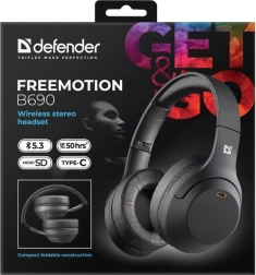 Stilske over‑ear slušalke DEFENDER Freemotion B690 v črni barvi združujejo udobje in čist zvok za vsak dan. Mehke ušesne blazinice in oblazinjen naglavni lok zagotavljajo prijetno nošenje tudi pri dolgotrajnem poslušanju, medtem ko brezžična povezava prek Bluetootha prinaša popolno svobodo brez kablov.
