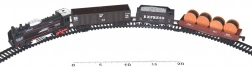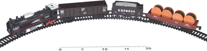Velika vlakovna garnitura. Dimenzije 122 × 68 cm. Dolžina proge 404 cm. Svetlobni učinki. 2x AA bateriji za lokomotivo nista priloženi.