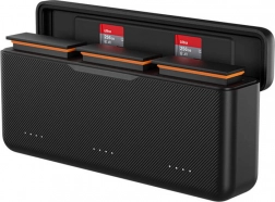 Konstrukcija 2-v-1 združuje polnilno postajo in trpežen transportni etui. Zahvaljujoč magnetnemu zapiranju ter namenskem prostoru za dve TF (microSD) kartici bo vaša oprema varna tudi na terenu. Kompaktne dimenzije se odlično prilegajo nahrbtniku – idealna rešitev za potovanja in dolge snemalne dni.