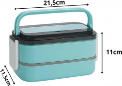Praktična dvonadstropna bento škatla s prostornino 1400 ml za udobno in zdravo prehranjevanje na poti. Zahvaljujoč zrakotesnemu zapiranju, pregradam in varnim stranskim sponkam ostane vaša hrana sveža in ločena. Idealna za službo, šolo, univerzo in piknik, priložen je praktičen pribor, škatlo pa je mogoče segrevati v mikrovalovni pečici.