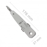 Profesionalno udarno orodje LSA/KRONE za hitro in natančno zaključevanje vodnikov v telefonskih in omrežnih vtičnicah. Ponuja zanesljivo stiskanje, samodejno odrezovanje odvečnih koncev in visoko vzdržljivost zahvaljujoč kaljenemu jeklu in ohišju iz ABS. Primerno za polni vodnik in večžilni kabel, senčene in nesenčene kable.