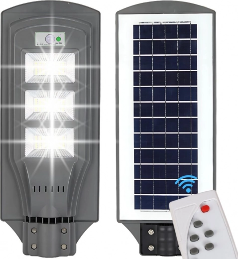 Zmogljiva sončna ulična svetilka za zunanje osvetljevanje brez kablov. Ponuja daljinsko upravljanje, senzor gibanja in mraka, zaščito IP65 ter varčno delovanje z jasno svetlobo za vrtove, dovoze, parkirišča in ulice.