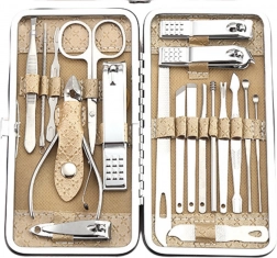 Kompleten 20-delni set za manikiro in pedikuro v elegantnem bež etuiju za vsakodnevno nego nohtov in kože. Vsebuje orodja iz nerjavečega jekla za dolgo življenjsko dobo, natančno urejanje nohtov in udobno uporabo doma in na poti.