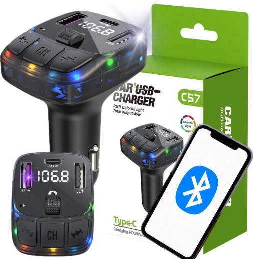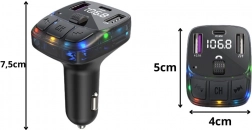 FM oddajnik za avto z Bluetooth 5.3, USB‑C PD 30 W in 2× USB, LED osvetlitev, prostoročno telefoniranje