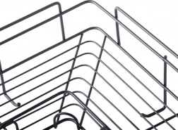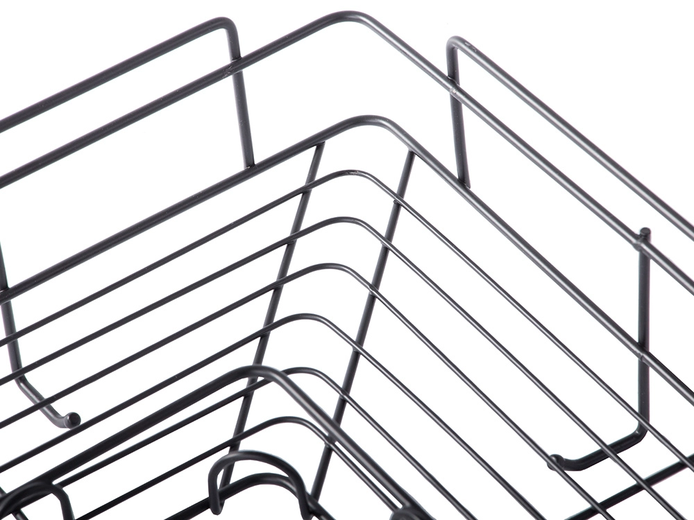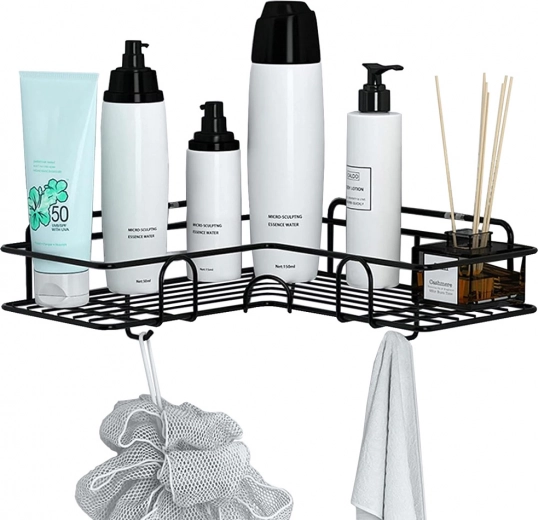 Maksimizirajte prostor v kotu prhe s to elegantno polico v črni barvi. Odprta žičnata zasnova ohranja kozmetiko suho in na očeh, povišani robovi preprečujejo padanje stekleničk, spodnji kavlji pa služijo za obešanje gobic ali brisač.