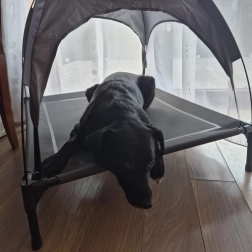 Ta izdelek je *idealen za velike pasme* kot so Border collie, Beagle ali Zlati prinašalec. Dodatno vašemu ljubljenčku nudi občutek varnosti zahvaljujoč senčenju baldahina, ki nudi zatočišče podobno naravnemu zavetrju.