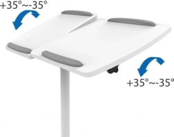 Nagibna delovna površina omogoča ergonomsko nastavitev kota do 35° navzgor in navzdol. Varnostni zadrževalniki in nedrseči elementi preprečujejo drsenje opreme, zato se lahko osredotočite na popolno predstavitev.