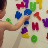 Popoln set za kopalnico ali bazen nudi 26 črk abecede in številke od 0 do 9, ki lahko prosto plavajo na vodi ali pa se, ko so mokre, pritrdijo na kad ali ploščice.