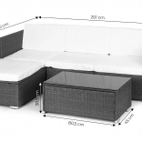 Stilna vrtna kotna sedežna garnitura iz tehno ratana MULTIGARDEN v sivi barvi prinaša modularno zasnovo iz 4 delov, vzdržljiv jeklen okvir in mizico s kaljenim steklom za udoben počitek in druženje s prijatelji. Blazine iz poliestra (160 g/m²) ter odpornost na vremenske vplive zagotavljajo preprosto vzdrževanje in dolgo življenjsko dobo.