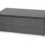 Tehno ratan je barvno obstojen, ne vpija vode in odporen na dež in sonce, zato lahko pohištvo ostane zunaj skozi celo sezono. Kaljeno steklo debeline 5 mm je odporno na poškodbe in varno pri vsakodnevni uporabi. Vzdrževanje je preprosto – obrišite z vlažno krpo.