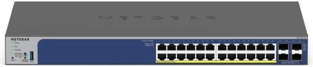 Inteligentno 24-portno stikalo PoE+ Gigabit Ethernet podjetja NETGEAR, namenjeno omrežjem različnih velikosti z možnostjo oddaljenega in oblaka upravljanja ter s štirimi SFP vrati in močjo 190 W.