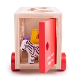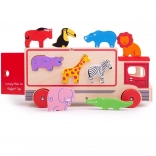 Ta pisano obarvana lesena igrača vsebuje prepoznavne živalske oblike, ki jih je mogoče naložiti na tovorno vozilo s posebnimi odprtinami na strehi in straneh vozila. Otroci lahko razvrščajo oblike in se učijo o različnih živalih, nato vsako žival vstavijo v pravilno odprtino. Ko so vse živali na svojem mestu, se zadnja vrata tovornjaka zaprejo in lahko se odpravijo na novo avanturo.