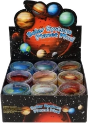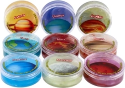 Odkrijte vesolje na igriv način s sluzjo, navdihnjeno s planeti! Vsak prozoren lonček skriva barvito, počasi raztezno sluz z motivi planetov, kot so Saturn, Jupiter, Zemlja in Neptun. Odlična senzorična igrača za otroke od 3 let naprej, ki spodbuja ustvarjalnost in fino motoriko.