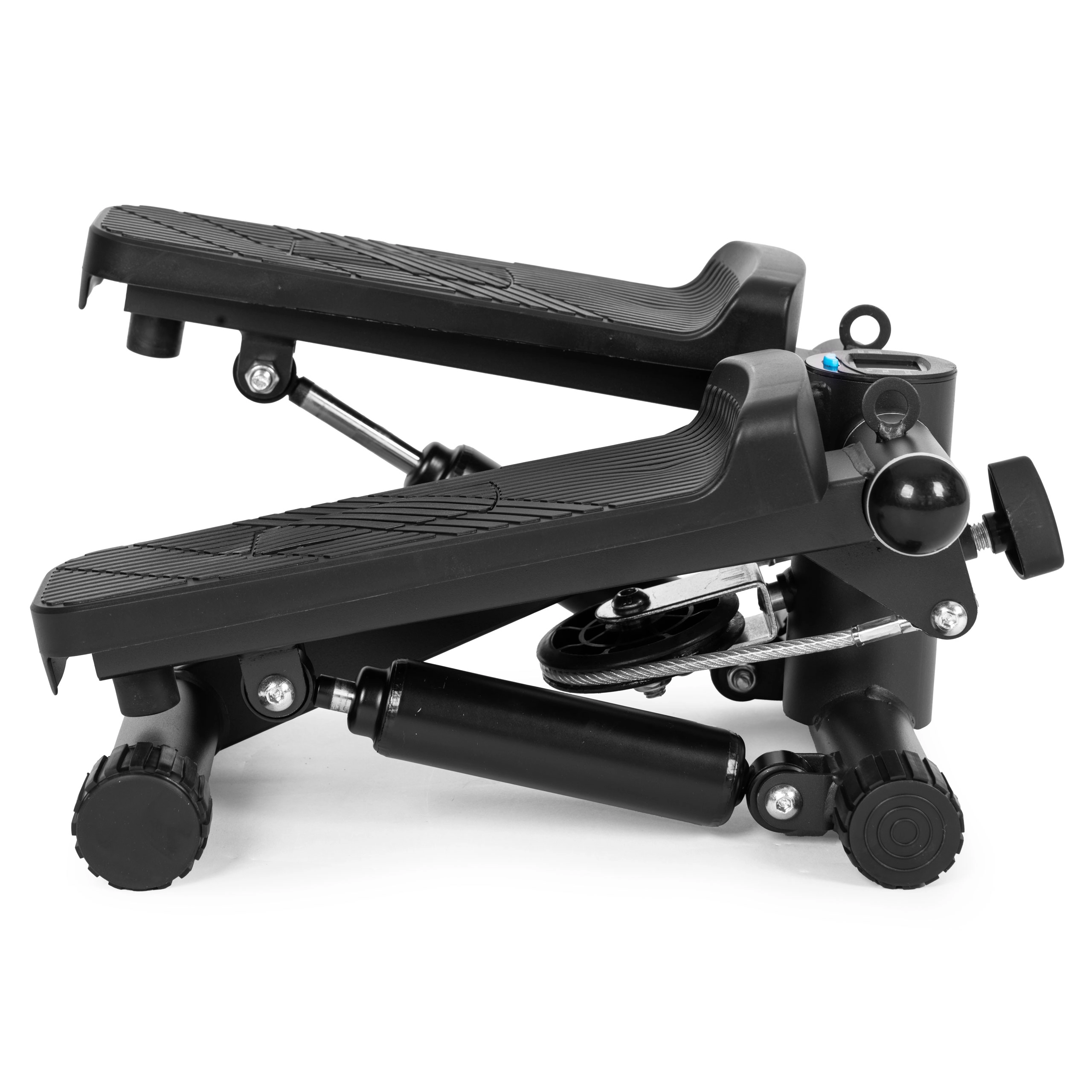 Kompakten stepper z uporovnimi ekspanderji za domačo vadbo omogoča učinkovito krepiti spodnji in zgornji del telesa, izboljšati kondicijo in kuriti kalorije. Robusten okvir iz jekla, ABS in TPE, nedrseče pedala, nastavljiva intenzivnost ter 5-funkcijski LCD zaslon za spremljanje časa, korakov in kalorij. Priloženi sta zaščitna podloga in stabilne nogice za varno vadbo na vsaki podlagi.