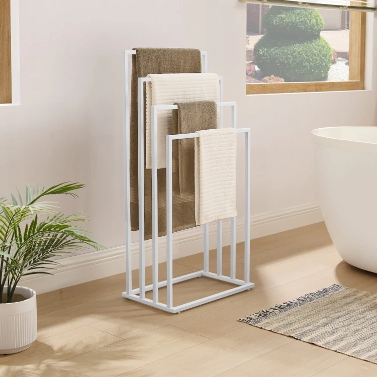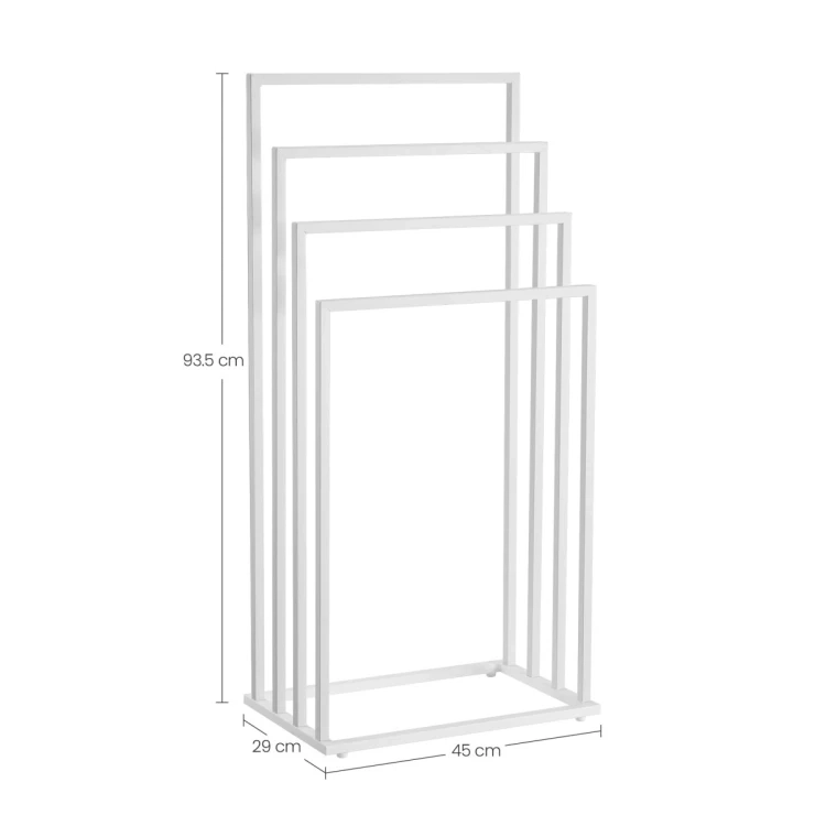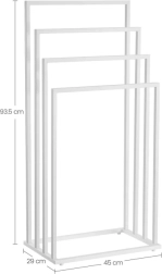 Elegantno prostostoječe stojalo za brisače s štirimi kraki v belo mat barvi ohranja vašo kopalnico in pralnico urejeno. Zahvaljujoč trdni jekleni konstrukciji in stopničasto razporejenim krakom zagotavlja hitro zračenje in enostavno sušenje brisač, kopalk in finega perila. Stabilen, trpežen in estetski dodatek za sodoben interier.