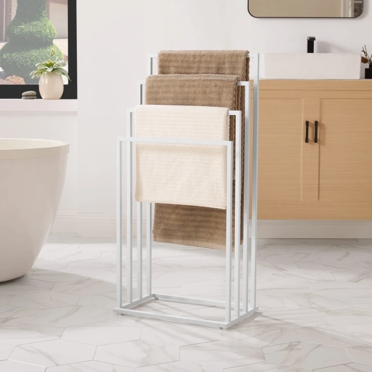 Prostostoječi sušilnik za brisače ponuja štiri ravni za pregledno obešanje in učinkovito kroženje zraka. Minimalističen dizajn v belo mat izvedbi se zlahka kombinira s katerim koli slogom kopalnice ter prinaša red in eleganco.