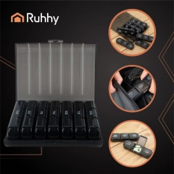 Ohranite svoja zdravila in dodatke popolnoma organizirane. Organizator RUHHY ponuja sedem samostojnih dnevnih škatlic, vsaka s tremi predelki za jutro, poldne in večer. Pregledno označevanje in zapiranje na klik zmanjšujeta napake ter zagotavljata, da imate odmerke vedno pri roki.