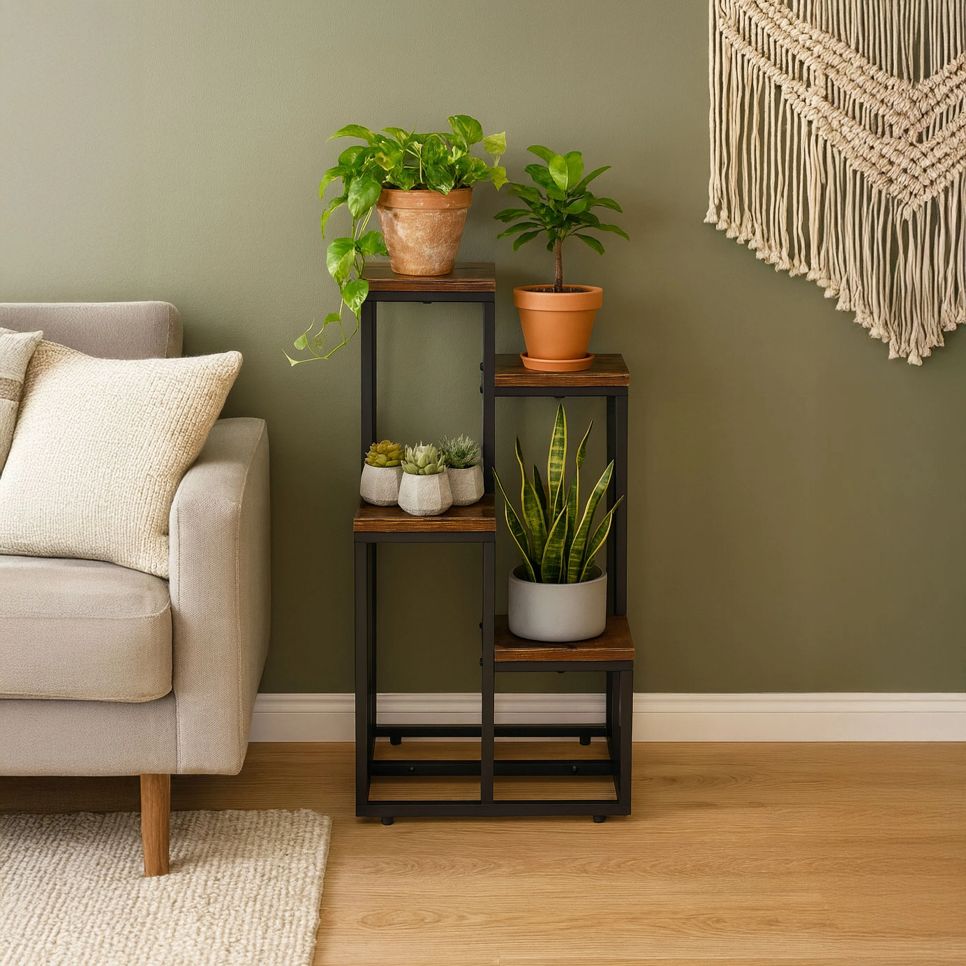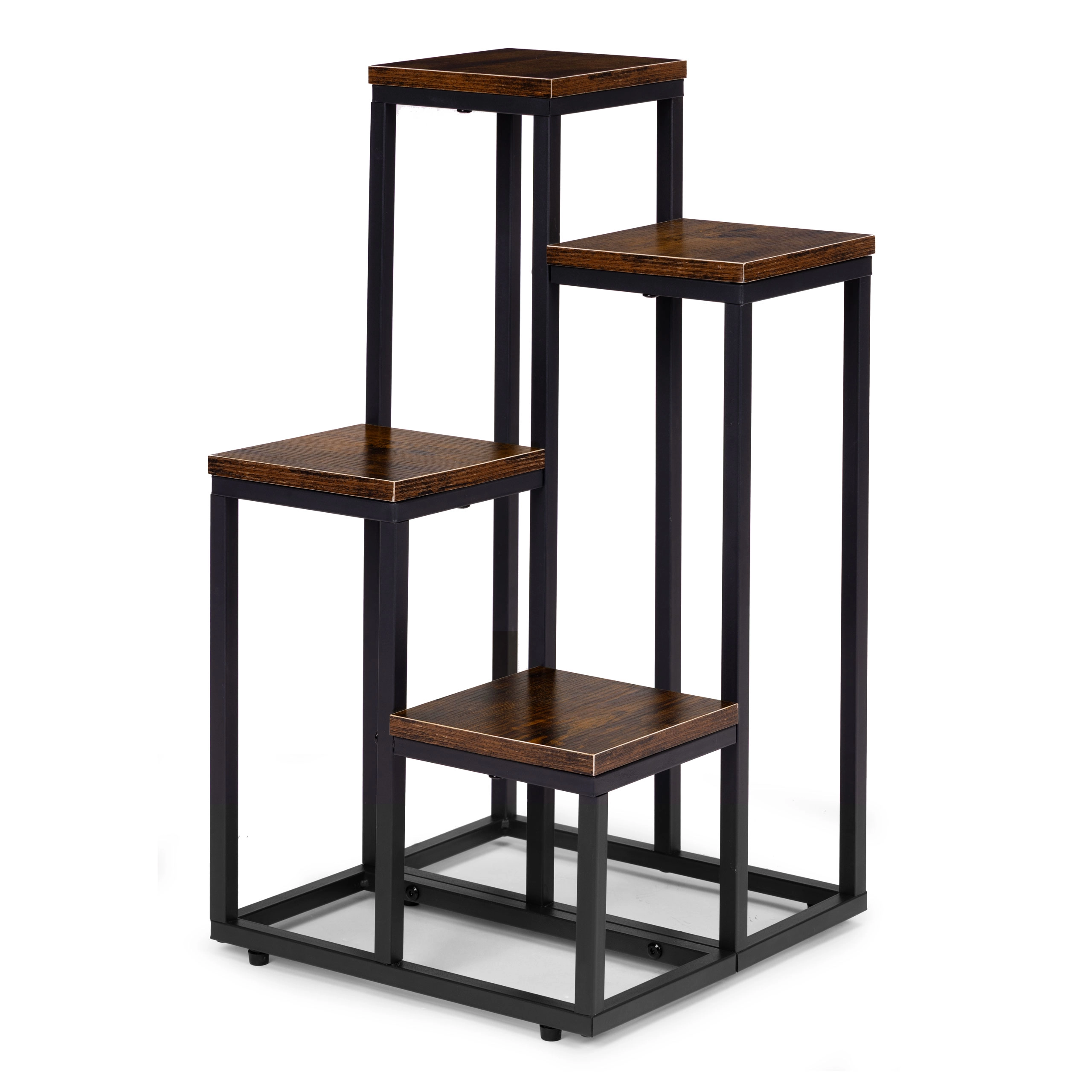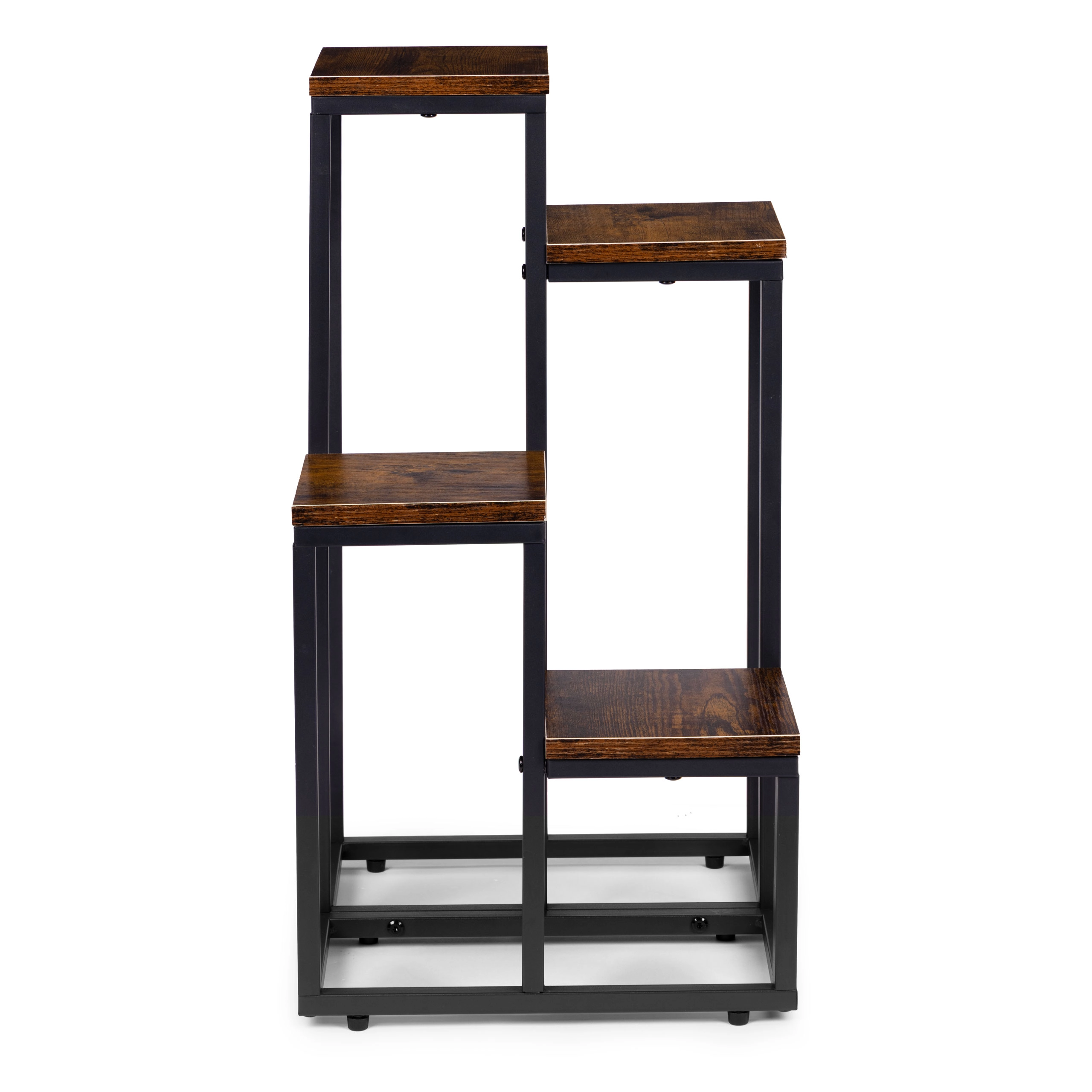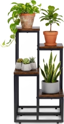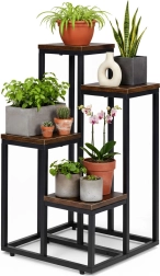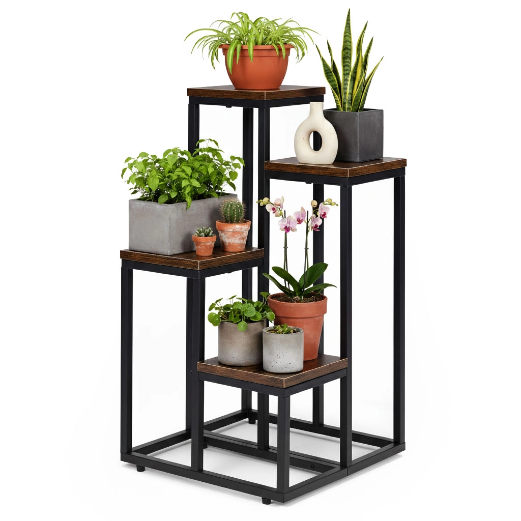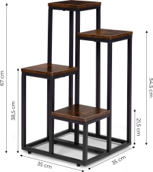Stilsko stojalo za rože v loft slogu z kovinsko konstrukcijo s prašnim lakiranjem in 4 praktičnimi policami prihrani prostor in elegantno razstavi vaše rastline. Zahvaljujoč stabilni zasnovi, proti zdrsu nogicam in kompaktnih dimenzijah je primerno za dnevno sobo, pisarno in tudi komercialne prostore. Univerzalna zasnova poudari zelenje in prostoru doda moderen industrijski videz.