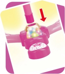 Roza karaoke mikrofon na stojalu spremeni vsako otroško sobo v oder. Ponuja 12 vgrajenih pesmi, barvite svetlobne učinke in možnost priklopa MP3 ali mobilnega telefona. Zahvaljujoč nastavljivi višini 40–80 cm raste skupaj z otrokom in je idealen za male pevce od 3. leta dalje.