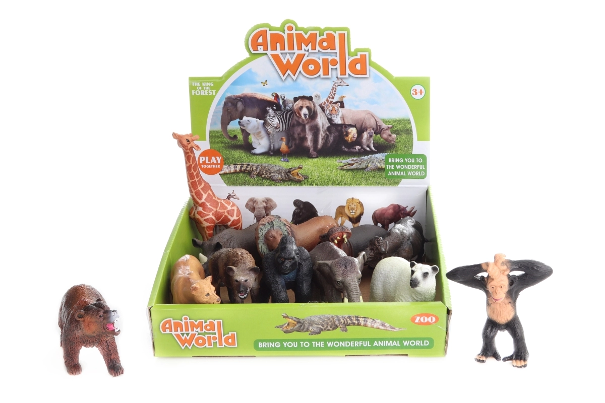 Ta bogat komplet prinaša 12 različnih živali: slon, bizon, polarni medved, hijena, gorila, šimpanz, povodni konj, rjavi medved, lev, levinja, nosorog in žirafa. Vsaka figurica meri približno 9–12 cm in ponuja dovršene detajle, ki spodbujajo domišljijo in naravno radovednost otrok.