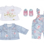 Komplet vsebuje belo majico z zlatim motivom, svetlo modro denim jaknico, modre kavbojske hlače z naramnicami s cvetličnim potiskom ter mehke nogavičke/copatke. Vse popolno pristaja punčkam velikosti 43 cm.