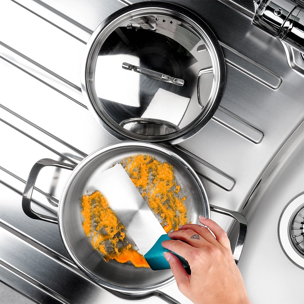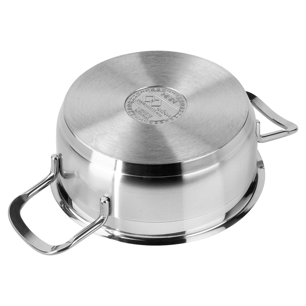 Robustno sendvič dno odlično akumulira in enakomerno porazdeljuje toploto, kar skrajša čas kuhanja in varčuje z energijo na vseh vrstah štedilnikov, vključno z indukcijo.