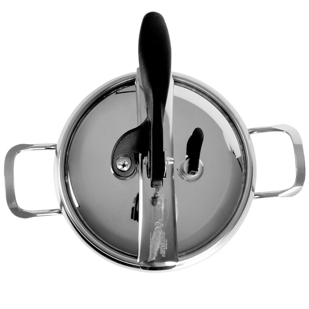 Zahvaljujoč dvema varnostnima ventiloma, možnosti regulacije pritiska in zanesljivemu sistemu zapiranja je uporaba lonca maksimalno varna. Ročaj pokrova iz bakelita ostane prijetno hladen. Lonec je združljiv s plinskimi, električnimi, steklokeramičnimi, halogenskimi in indukcijskimi kuhalnimi ploščami. Za enostavno vzdrževanje ga lahko pomivate v pomivalnem stroju (brez pokrova).