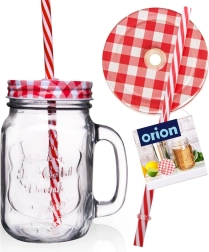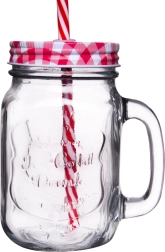 Eleganten stekleni vrč s prostornino 450 ml z ročajem, navojnim pokrovčkom in večkrat uporabno slamico za udobno pitje. Idealen za vodo, limonado, koktajle in mešane pijače. Odporno, debelostensko steklo s stilskim reliefnim napisom in pokrovček proti razlitju in insektom zagotavljata brezskrbno osvežitev doma in na prostem.