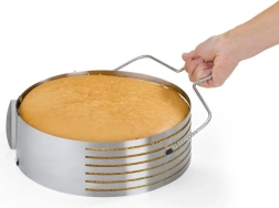 Praktičen strunski nož za torte in biskvite z dvema ostrima strunama za hitro in enakomerno rezanje biskvitnih korpusov na plasti. Izdelan iz nerjavečega jekla, je lahek, trpežen in ponuja nastavljivo višino reza od 1,6 do 6,2 cm. Primeren za pomivalni stroj in z gumijastimi kapicami za zaščito delovne površine.