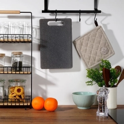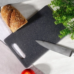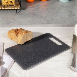 Praktična kuhinjska deska v sivi barvi s kamninskim videzom je idealna za vsakodnevno rezanje. Izdelana je iz trpežne plastike, ki je higienska, ne vpija vonjav in ne vsrkava tekočin. Zahvaljujoč integrirani odprtini se zlahka prenaša in obeša ter jo je možno pomivati v pomivalnem stroju.