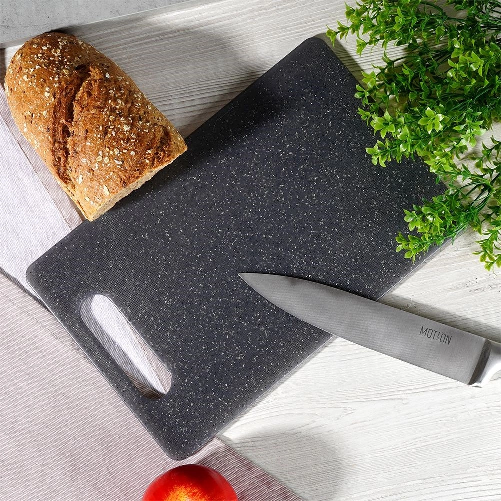 Univerzalna plastična deska za rezanje živil z merami 31 × 20 cm je zanesljiv pomočnik v vsaki kuhinji. Trpežen material v sivi barvi z “granitnim” učinkom je prijazen do nožev, primeren tudi za keramična rezila, hkrati pa odporen proti običajni obrabi.