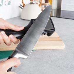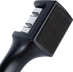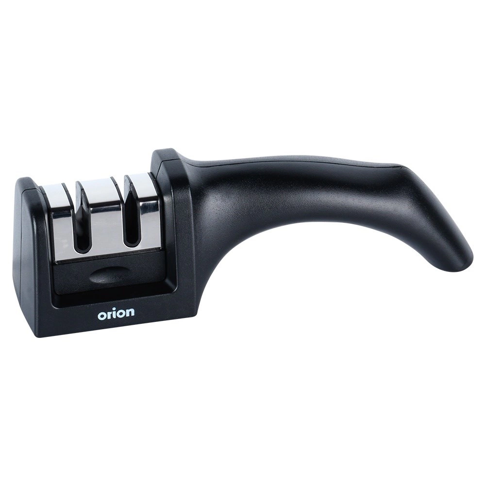 Privoščite svojim nožem natančno nego z dvofaznim brusilcem ORION. Prva stopnja s karbidno glavo hitro obnovi topo rezilo, druga stopnja s keramičnim vložkom ga nežno zgladi in spolira za dolgotrajno ostrino. Stabilna nedrseča osnova in oblikovan ročaj zagotavljata varen oprijem tudi pri večjem pritisku.