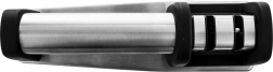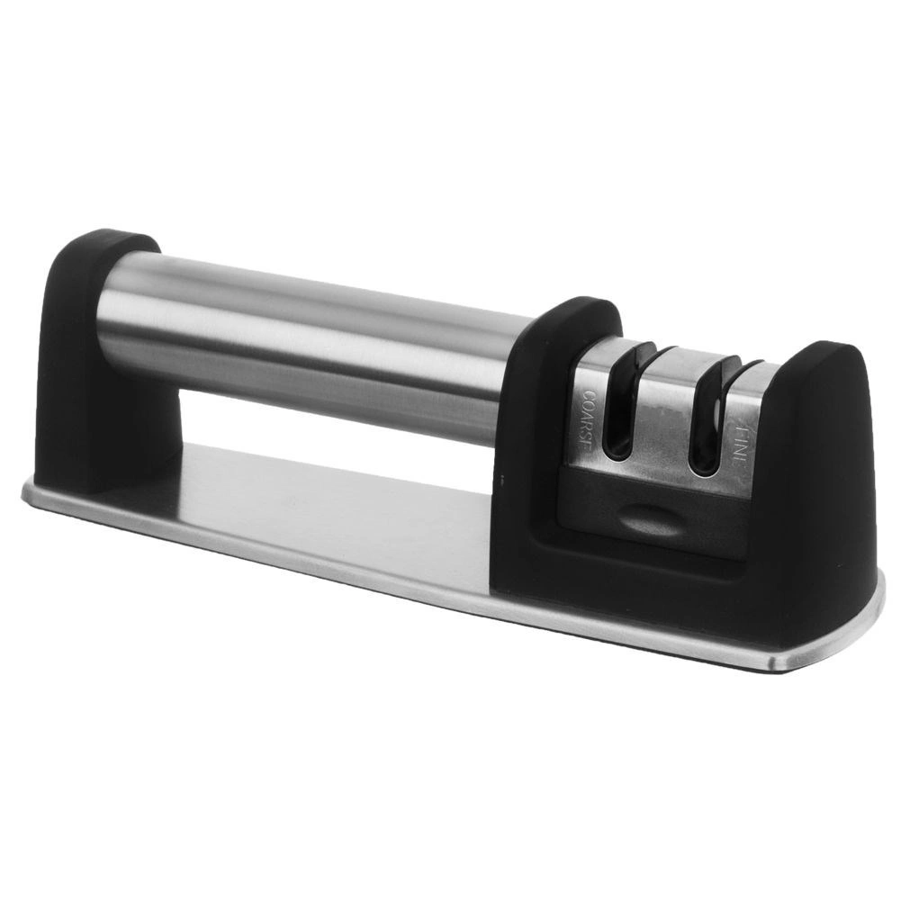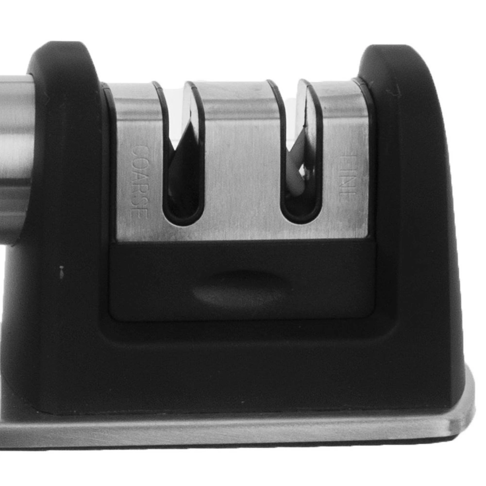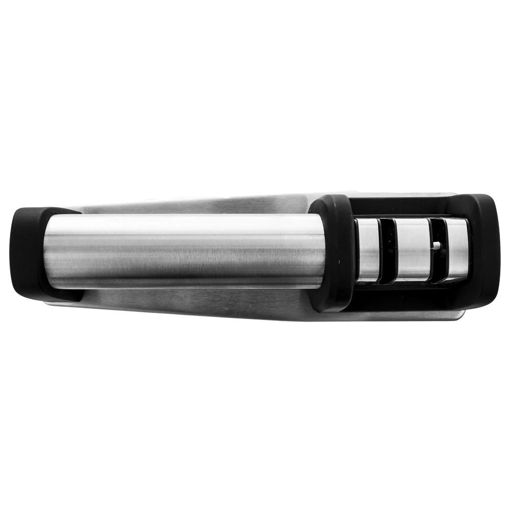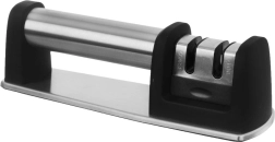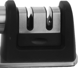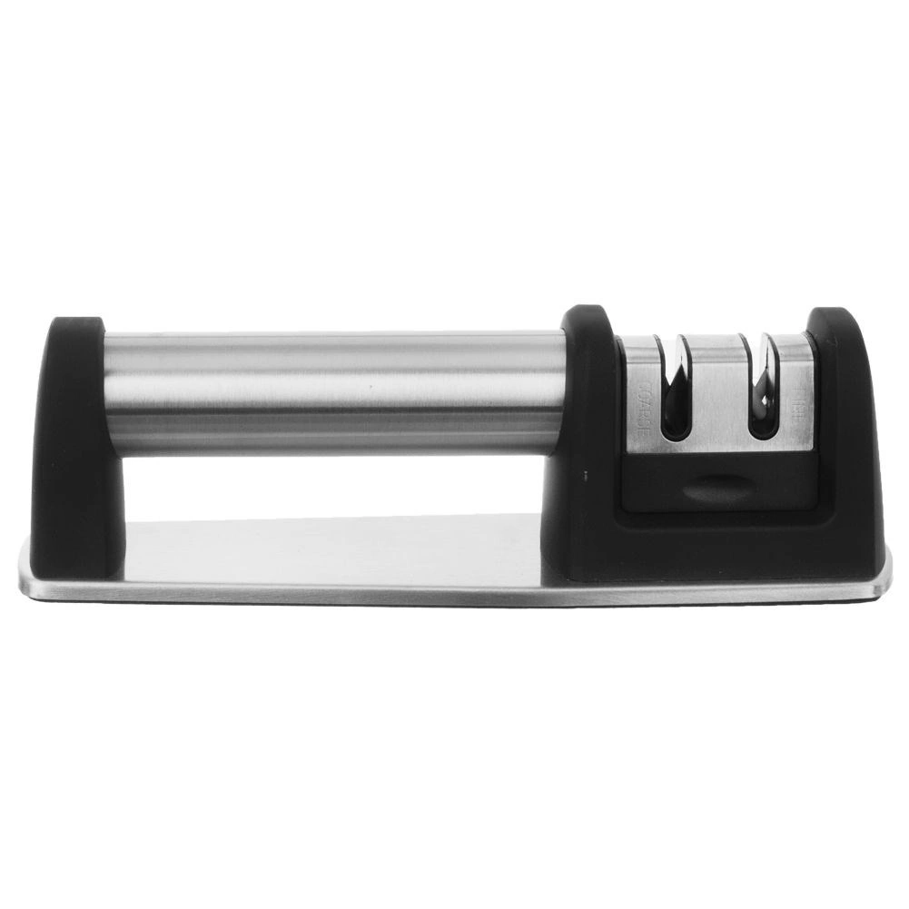 Praktičen dvostopenjski brusilec za nože z ohišjem iz nerjavnega jekla in protizdrsnim podstavkom za varno in udobno brušenje. Ponuja grobo brušenje z diamantnimi delci in fino keramično honanje za popolno obnovo rezila. Primeren za različne vrste kuhinjskih nožev, enostaven za uporabo in zaradi kompaktnih mer ga lahko shranite tudi v predal.