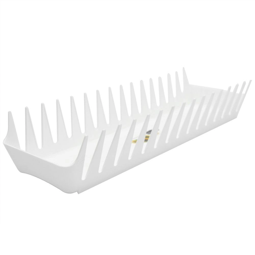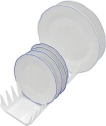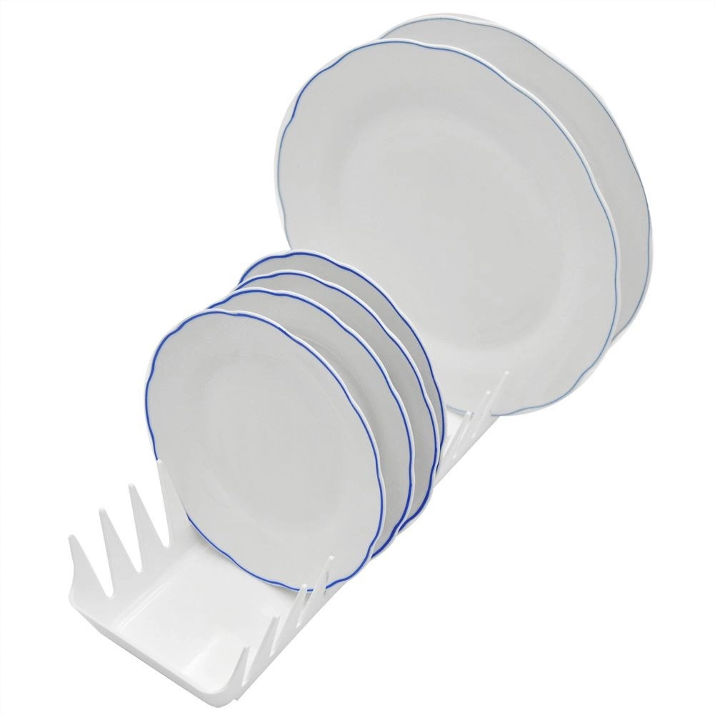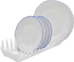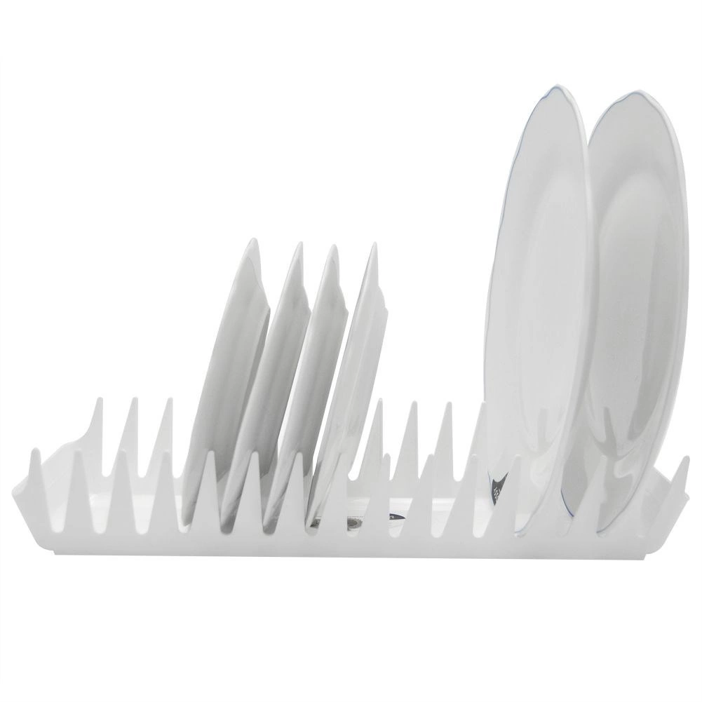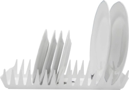 Ohranite red v kuhinji in pospešite sušenje posode. To belo plastično odcejevalno stojalo za krožnike ponuja kapaciteto do 15 kosov in zahvaljujoč navpični postavitvi zagotavlja optimalno kroženje zraka. Uporabite ga lahko na kuhinjskem pultu, v omarici ali v globokem predalu.