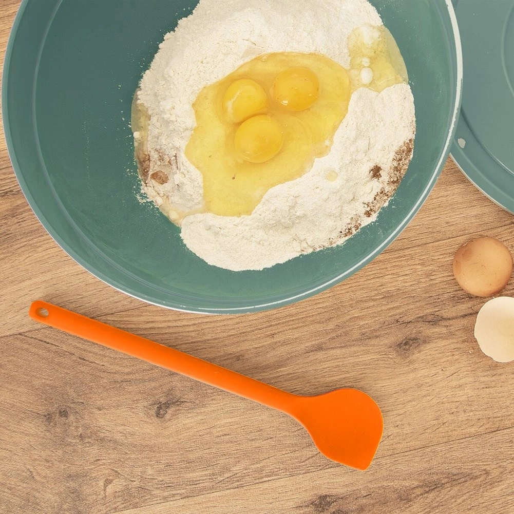 Ta oranžna silikonska lopatka je zanesljiv pomočnik za vsakodnevno kuhanje in peko. Zahvaljujoč odpornosti na temperature od -40 °C do 220 °C zlahka obvlada mešanje v ponvi in delo z vročimi jedmi, hkrati pa ne opraska teflonskih, keramičnih ali drugih neprijemljivih površin.
