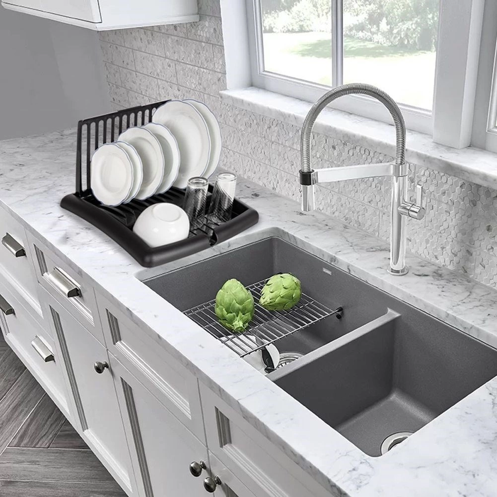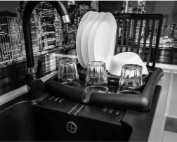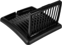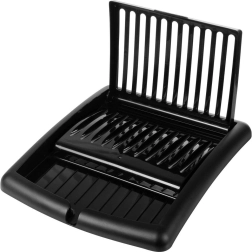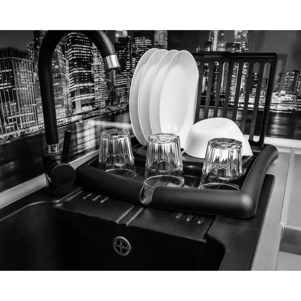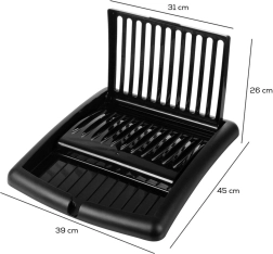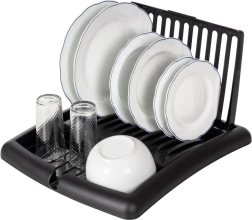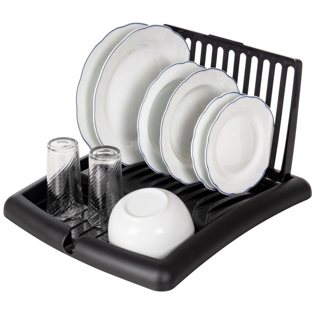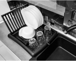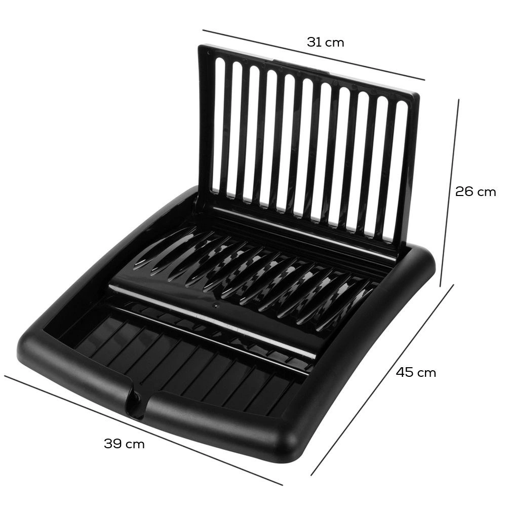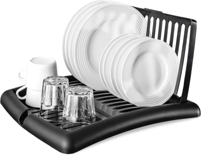 Kompaktno, zložljivo odcejalno stojalo za posodo v elegantni črni barvi prihrani prostor in ohranja vašo kuhinjo urejeno. Ponuja reže za do 11 krožnikov, površino za skodelice in kozarce ter integriran odtočni izlivček za odvajanje vode neposredno v pomivalno korito. Izdelano je iz kakovostne plastike, ki je odporna, enostavna za čiščenje in ne rjavi.
