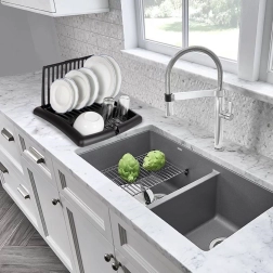 Integriran izliv odvaja odvečno vodo s sušilne površine v korito, zato delovna plošča ostane suha in čista.
